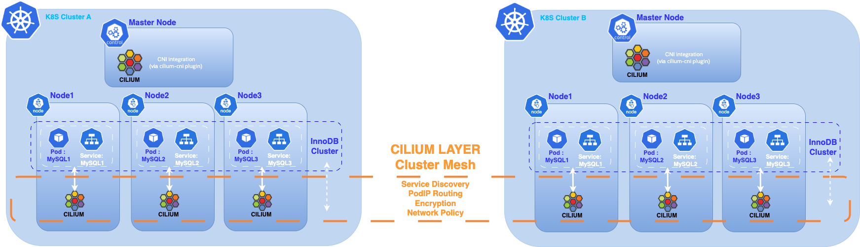 This project demonstrates how to deploy a MySQL InnoDB ClusterSet across two Kubernetes clusters interconnected using Cilium Cluster Mesh.