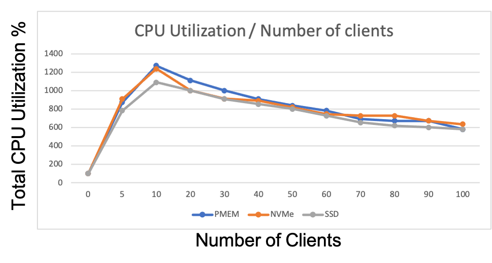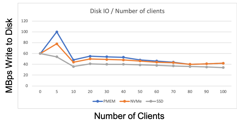 I configured the system for App Direct mode and mounted a folder in the pmem0.The pmem0 device is accessible to cores on both sockets but is directly attached to only one of the sockets. I had to test to make sure we were running the etcd server on the socket with the lowest latency and highest bandwidth to the pmem0 device. I recognize that this configuration represents a lot more resources (memory and cores) than what is usually dedicated to an etcd cluster node, but it was the only configuration I had available… Using our this infrastructure and limiting the etcd server to 18 cores, we ran a test scaling the number of clients from 100 to 50 000. We also placed the backing store in different locations, either in the pmem0 directory mounted as above, in an Optane NVMe drive, or on a traditional flash-based SSD. We also used two values for the number of connections per client 50.