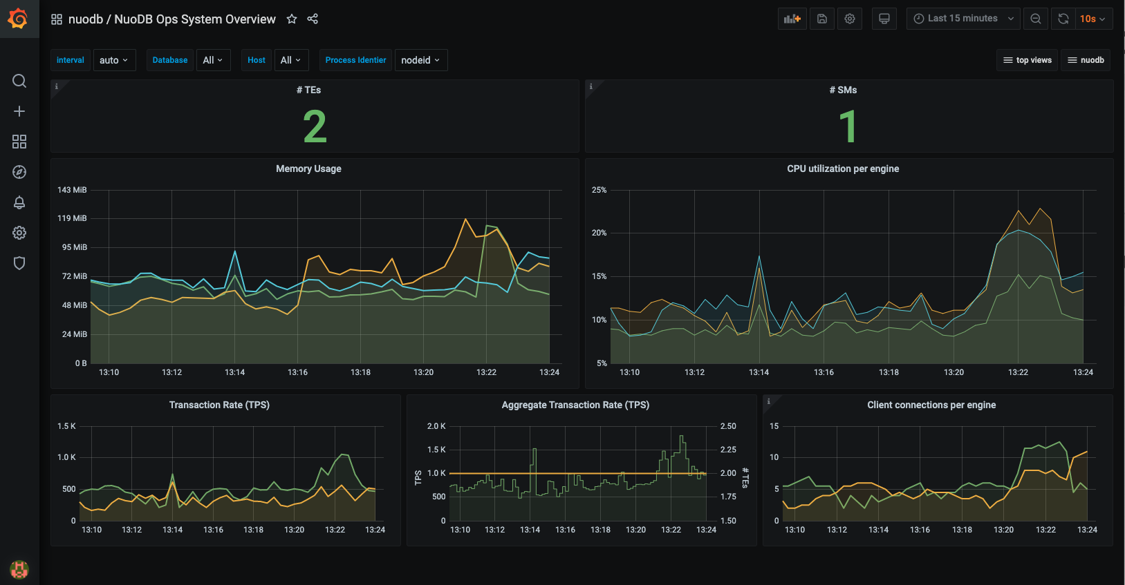 You can now easily monitor your NuoDB database.Different grafana dashboards are delivered. You’ll have access to real-time and historical trend data, including: