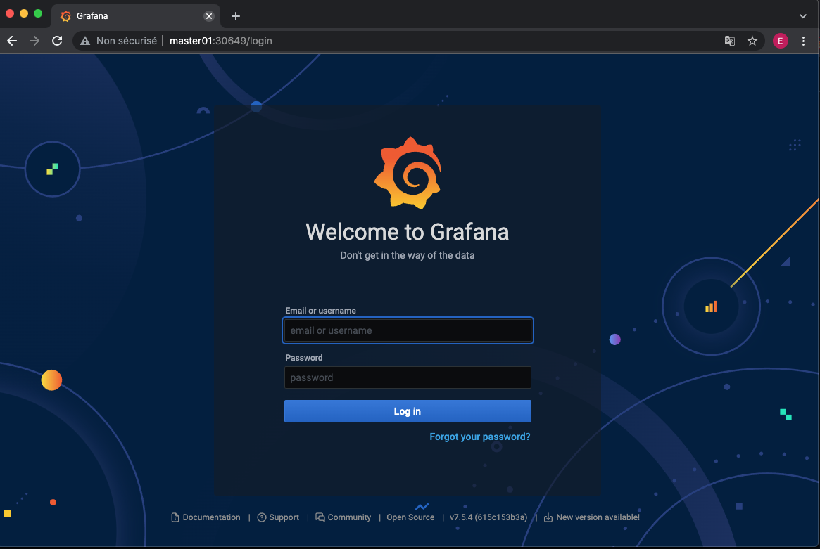 insights-grafana NodePort 10.96.190.96 <none> 80:30649/TCP 26mI will access the WebUI dashboards with the public ip address of one of the cluster nodes on port 30649