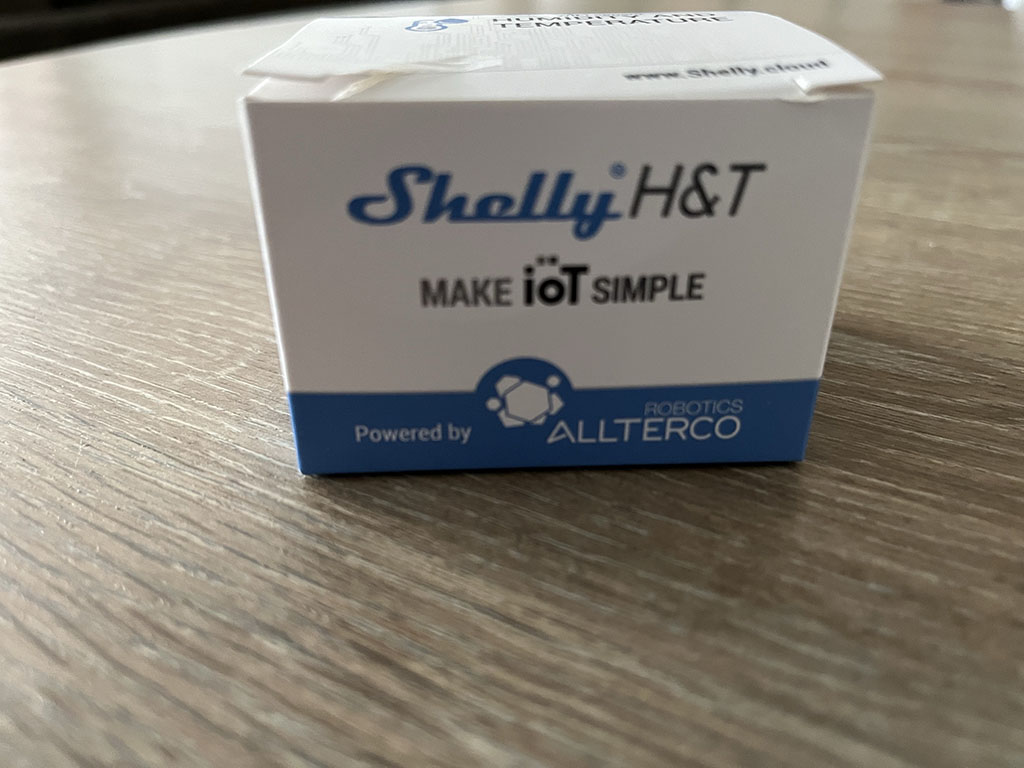 The Shelly H&T comes in a small 6.5 x 6.5 x 4.5 cm cardboard package in a cool white and blue glossy print. Highlighted are: Wi-Fi operation, SSL connectivity, cloud service… and a cool pun with MAKE IoT SIMPLE….